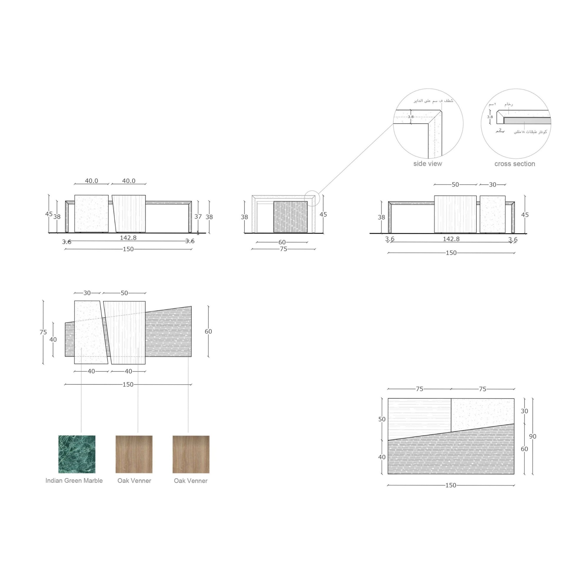-Set of 3 tables Plywood + Oak Veneer + Indian Green Marble.