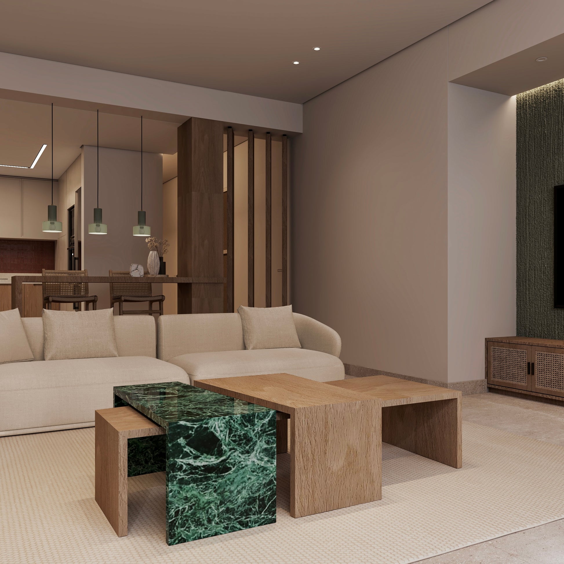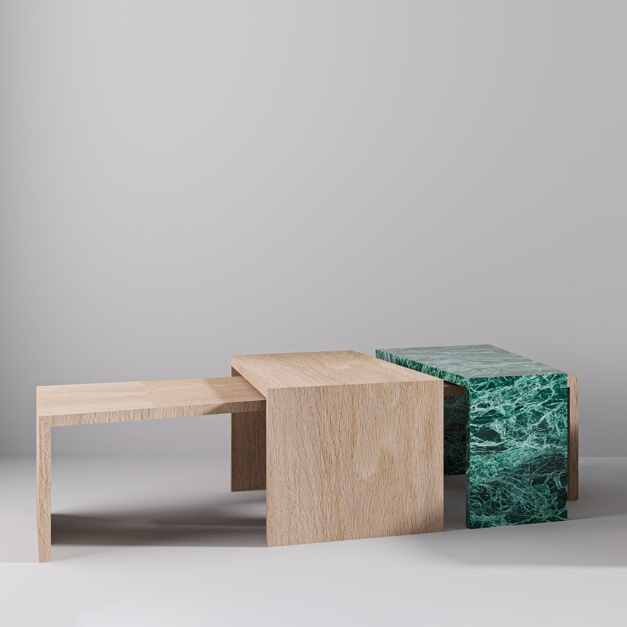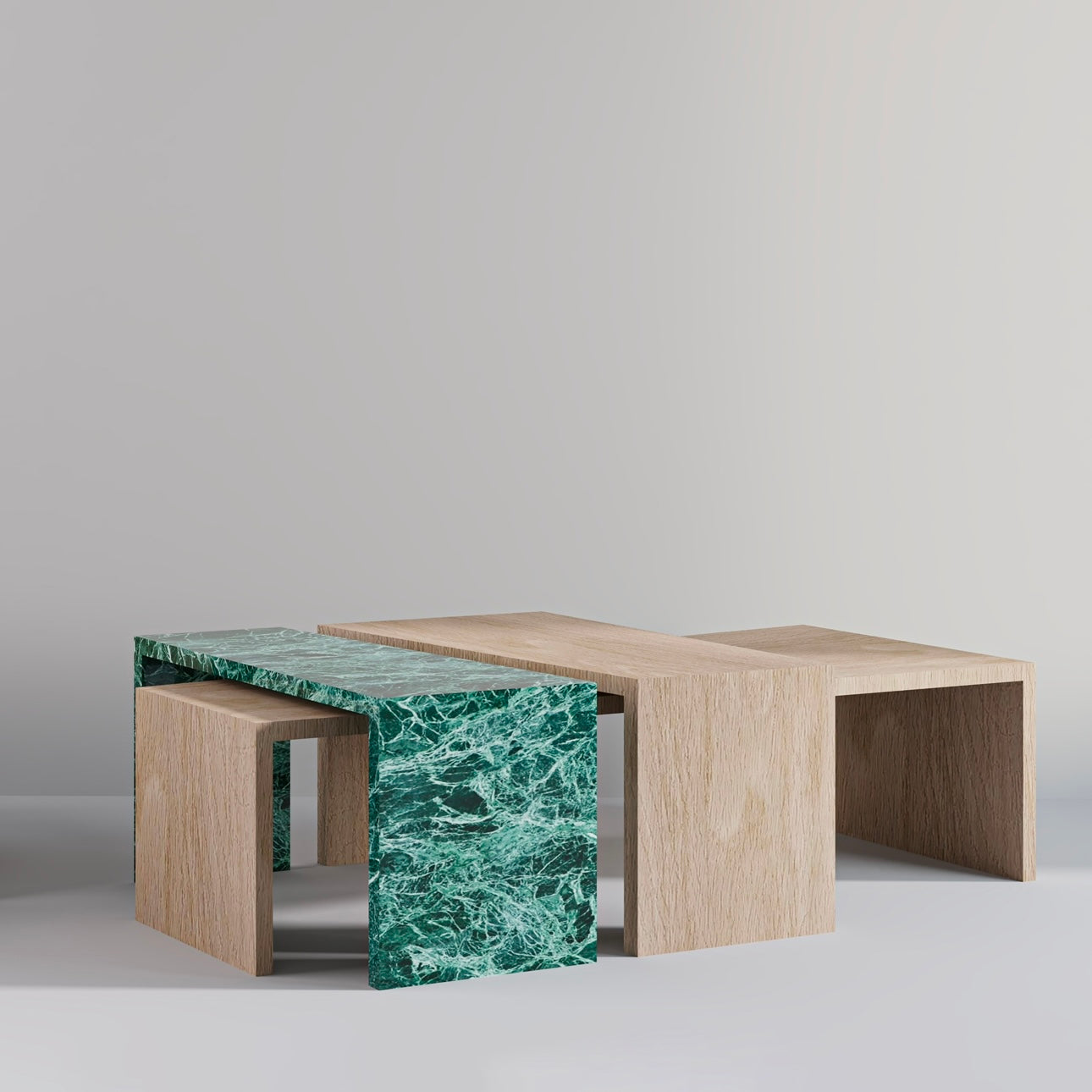 TRIOFORM is a center table set that celebrates quiet tension between textures, materials, and forms. Crafted from natural wood and richly veined marble, each piece slips into the next with precise asymmetry, revealing a balance between softness and solidity, warmth and coolness, grain and stone.